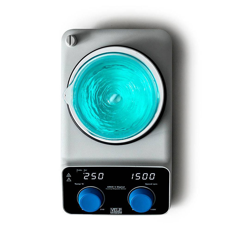 Powerful stirring for all lab applications. You can rely on the powerful brushless motor of the AREX 5 Digital for all your laboratory reactions as it stirs volumes up to 20 L (H2O). Speed setting is precise ranging from 50 to 1500 rpm making the AREX 5 Digital suitable for both low and high-speed applications. The AREX 5 Digital is equipped with VELP-engineered SpeedServo™ torque compensation technology that ensures constant speed even when the viscosity of the medium changes. The strong magnetic coupling supports reactions with multiple vials ensuring constant speed in all positions.