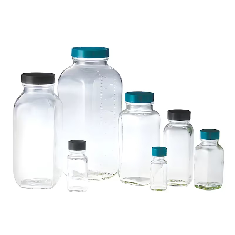 Square design maximizes space. Available with a choice of cap styles, PTFE lined, Polyseal, Vinyl lined Pulp or 14B White lined. PLEASE NOTE: BOTTLES ARE AVAILABLE PLASTIC COATED, WITHOUT CAP AND ALSO BULK PACKED. PLEASE CONTACT US FOR DETAILS.
