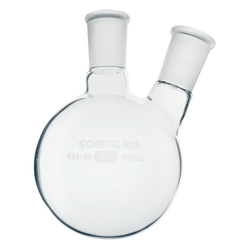 Round bottom, HEAVY WALL two neck flask with standard taper outer joints on both the center neck and angled side neck. Flasks with 10/30 side neck are for use with CG-3506 thermometers. Flasks with joint sizes other than those listed are available, contact us for details.