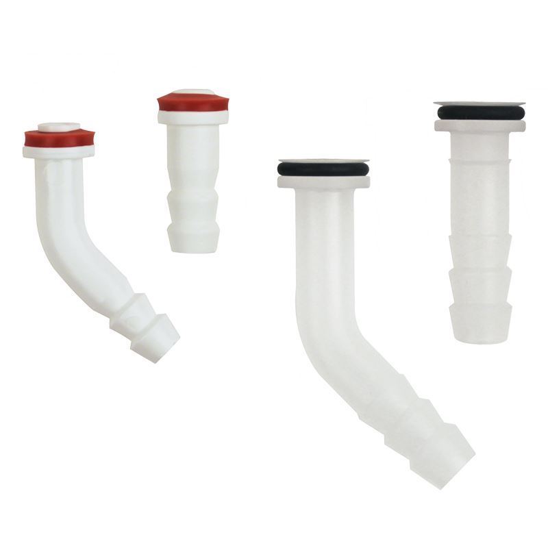 Polypropylene hose connections with a Viton rubber seal for use with GL-14 or GL-18 glass screw threads for working temperatures up to max +110°C. Enables the connection of cooling or vacuum hose by simply screwing either style (straight or bent) onto the glass thread instead of forcing Tygon tubing over a serrated glass connector.