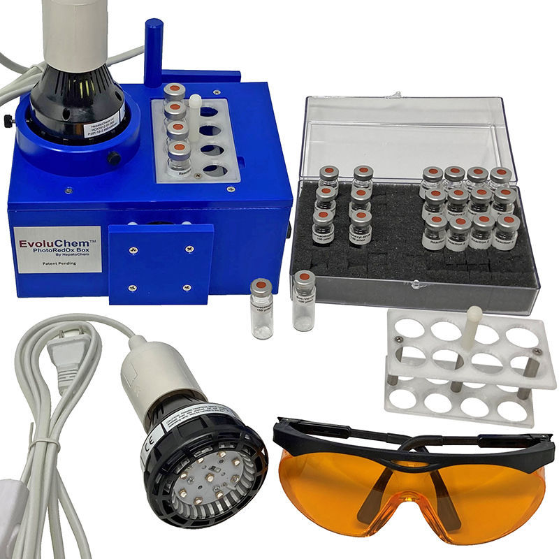 Advances in photochemistry continue to arrive on a regular basis, enabling new and efficient pathways to key chemical synthesis reactions and techniques, including multiple C-C cross-coupling options, C-N cross-coupling, and otherwise difficult C-O cross-coupling. The EvoluChemâ„¢ PhotoRedOx Box device (US Patent #10,906,022) is designed to facilitate photochemical experimentation. This device is compatible with most vial formats (0.3 ml, 2 ml, 4 ml and 20 ml vials) and its compact design allows for use with any stirring plate. A built-in fan keeps the reaction conditions at room temperature.