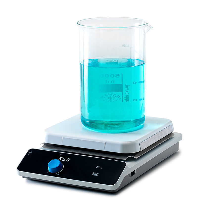 The hotplate features a robust 10-inch ceramic square plate that is highly resistant against acids, bases, and solvents. Its technopolymer structure is designed to prevent accidental liquid spills from reaching the electronic components.