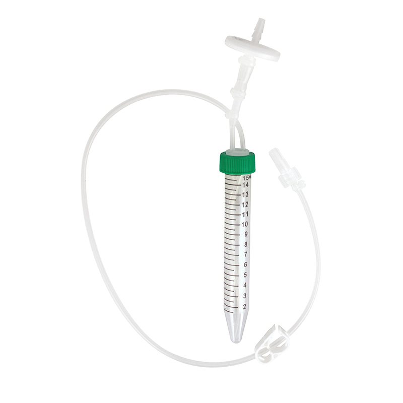 The 15mL polypropylene centrifuge tube assembly utilizes a closed cap assembly with 18” of 1/16" ID x 1/8” OD TPE tubing inlet line with a pinch clamp and a capped male lure lock end. The assembly includes a 3” vent line with a 25mm PES filter. Assembly is certified sterile.